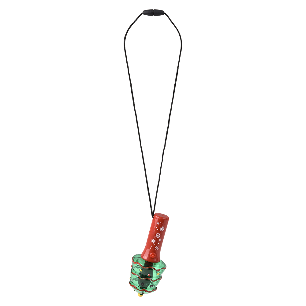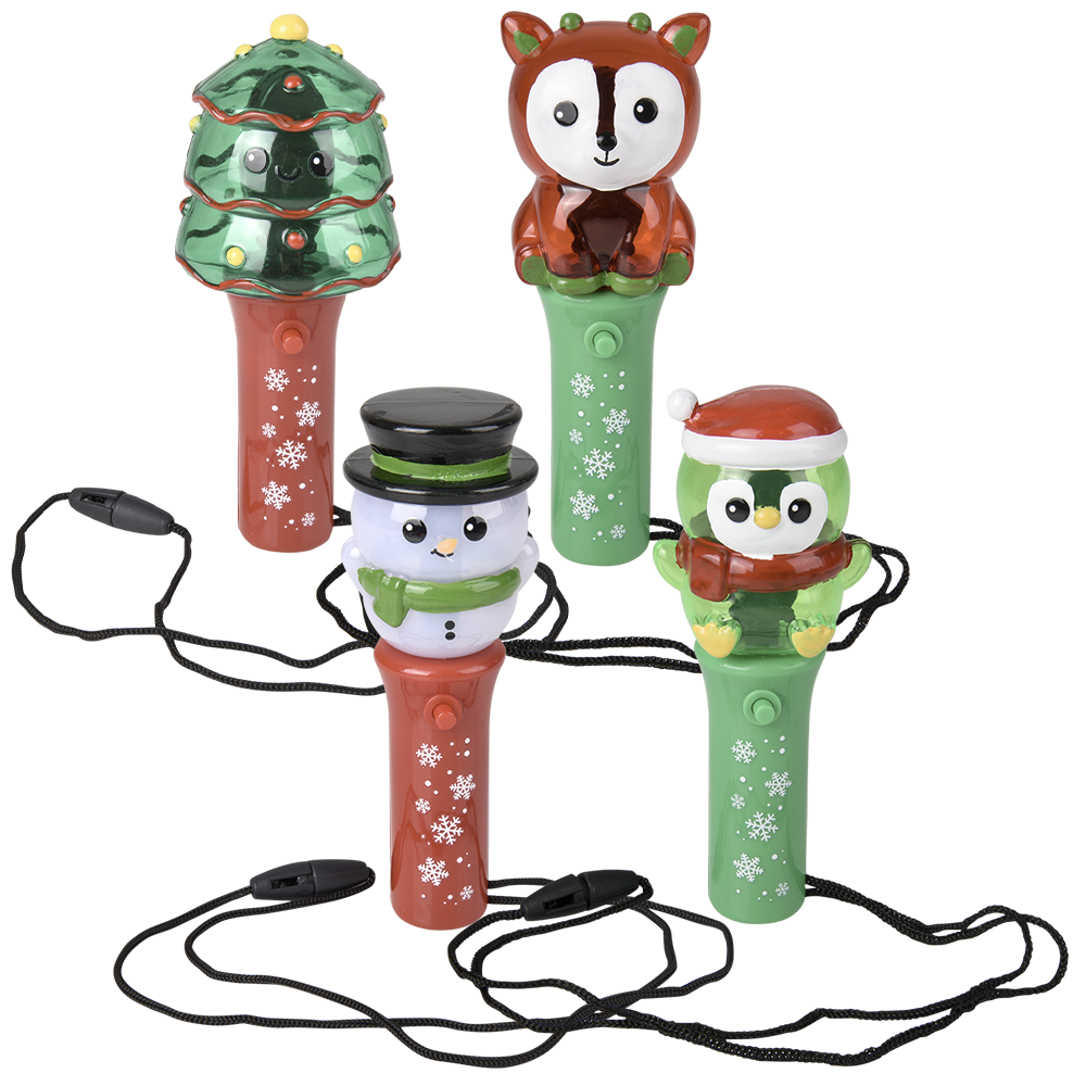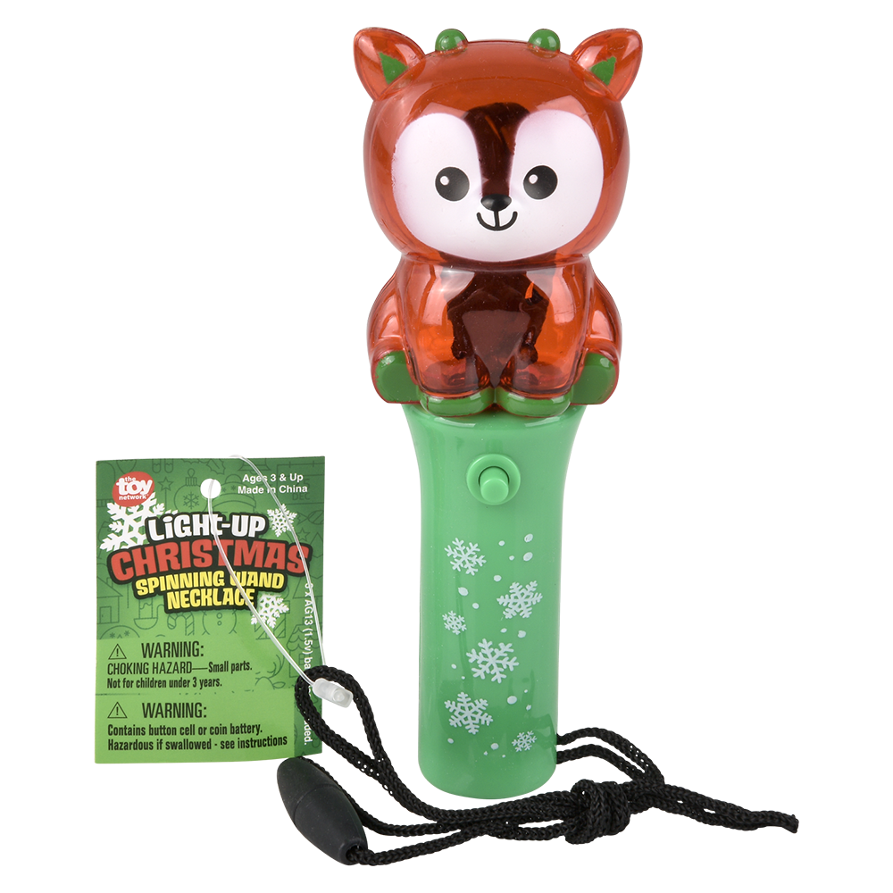Find the perfect stocking stuffer with these Lightup Mini Christmas wands that double as a necklace! Assorted styles, receive at random, Each with a hang tag. Includes 3XLR44 batteries.